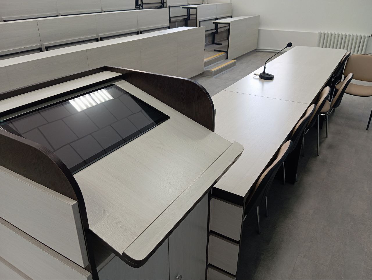 Для работы с цифровыми материалами и проведения интерактивных занятий трибуна лектора имеет сенсорный экран.